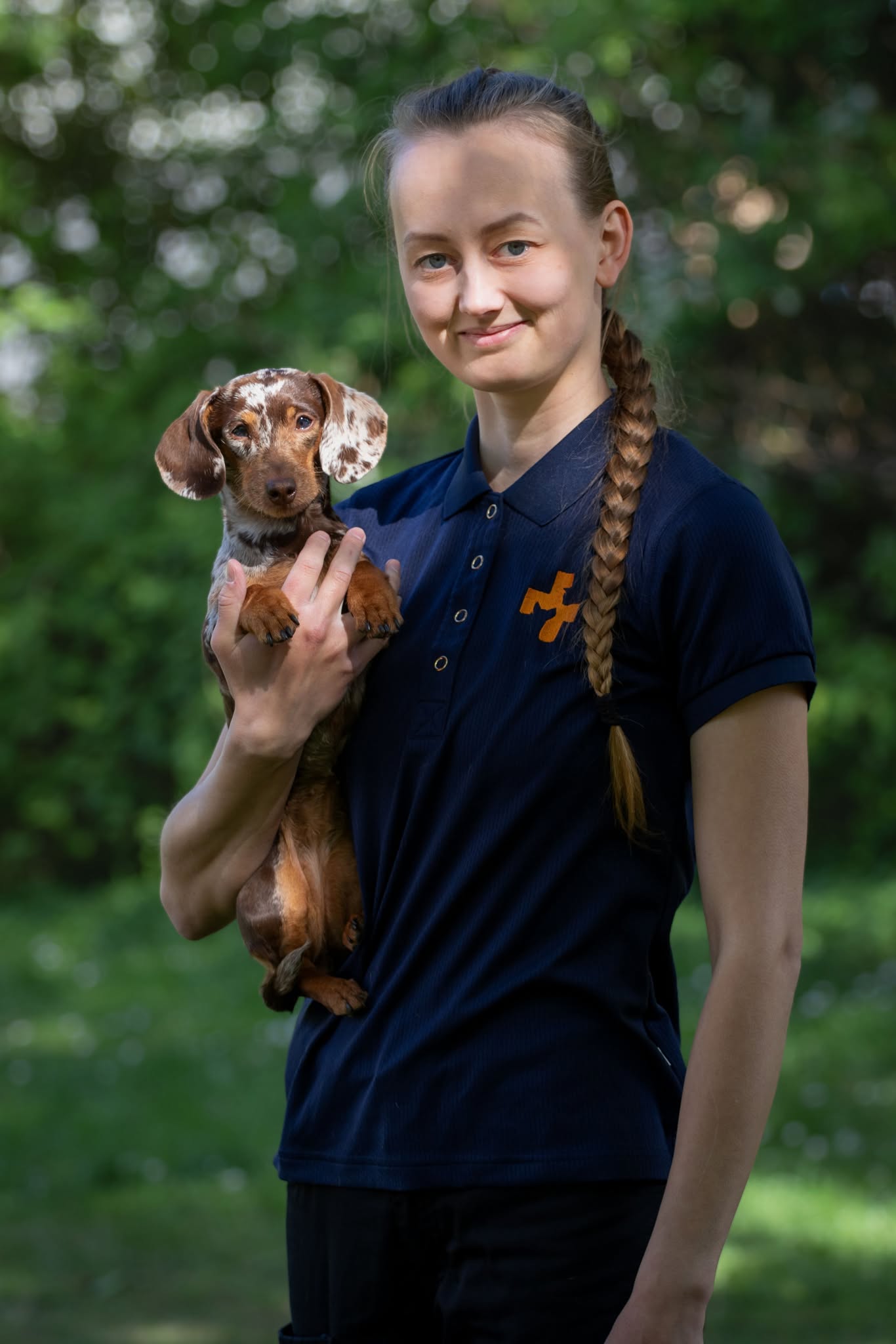 På fritiden hittar du mig helst ute i naturen – tillsammans med min sambo och lilla taxen Iza eller min häst Katy.
